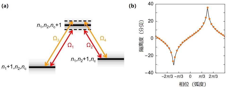 图a,基于光力相互作用的非互易声子耦合机制。b,通过控制激光相位,声子隔离度±30分贝连续可调。