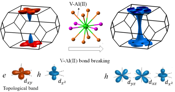 图一:在VAl3 中,V-Al间的化学键对其中的拓扑电子具有保护作用。该化学键的断裂导致一个拓扑相变。