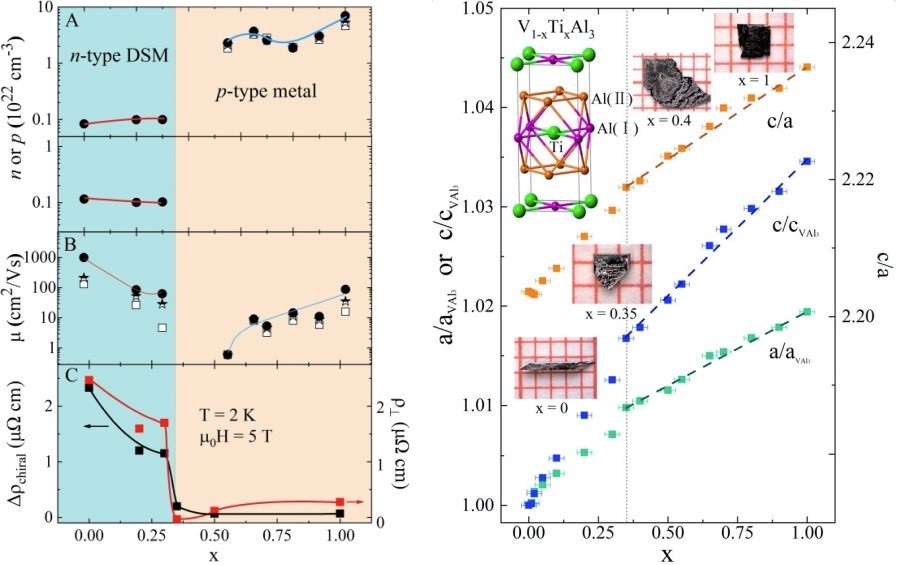 图二:左图所示V1-xTixAl3在x=0.35时由n-型狄拉克半金属变为p-型拓扑平庸金属。右图所示这一化学键断裂导致的拓扑相变伴随着较大的晶体结构和形貌的变化