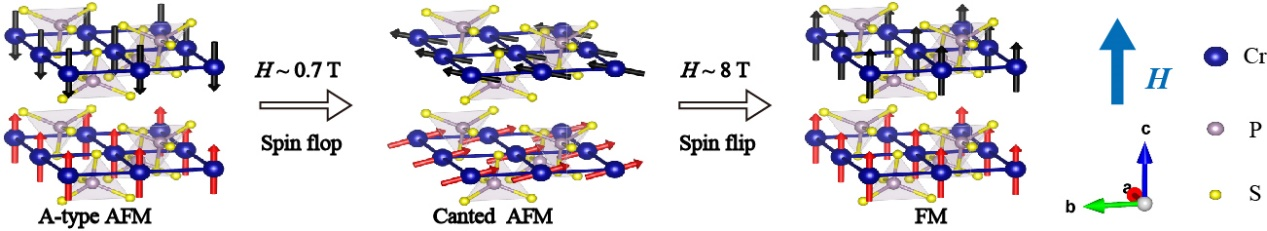 自2017年来,二维磁性在单层材料中的实现使得二维磁性材料得到了极大的关注。这些范德瓦尔斯磁体让我们对二维极限下的磁性有了更进一步的了解,不同磁结构的范德瓦尔斯磁体使得实验上探究二维下的磁学模型成为可能。比如,Ising铁磁在单层CrI3中发现,而且XY模型的NiPS3在单层极限下磁性被抑制。除了这些,有着变磁行为的范德瓦尔斯磁体则甚至更有趣,比如在少层CrCl3中由于奇数层存在着的未补偿磁矩,使得奇数层存在着spin-flop转变,而偶数层则没有。然而现存的二维磁性材料却非常稀少,这些促使着对于新范德瓦尔斯磁体的发现,不仅仅是有助于对二维磁性的研究,更是对二维自旋电子学器件应用提供了材料基础。