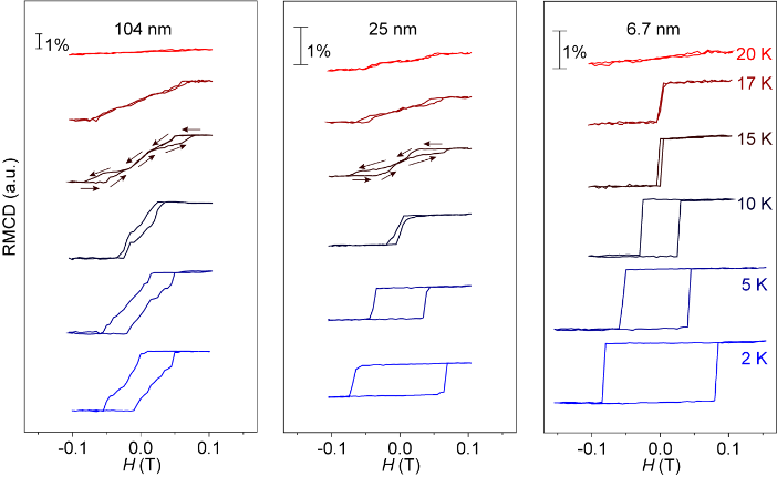 对此,杨金波课题组与叶堉课题组合作发现了一种新型的四元二维铁磁半导体AgVP2Se6,为稀少的二维铁磁家族增添了新的成员。AgVP2Se6的居里温度为18 K,磁畴沿着面外c轴方向。通过机械剥离得到了最薄4层(2.9 nm)的样品,并研究了少层材料的磁性。对于较厚的样品,磁滞回线表现为台阶状。随着厚度的降低,磁滞回线逐渐变方。测量的最薄样品(6.7 nm)在居里温度以下各温度磁滞回线完全演变为方形,成为了一个硬磁材料。这一成果近期发表在了Advanced Functional Materials上,文章题为“A quaternary van der Waals ferromagnetic semiconductor AgVP2Se6”(DOI: 10.1002/adfm.201910036)。太阳集团城网址古天乐博士生彭宇轩第一作者,通讯作者为太阳集团城网址古天乐叶堉研究员与杨文云工程师。