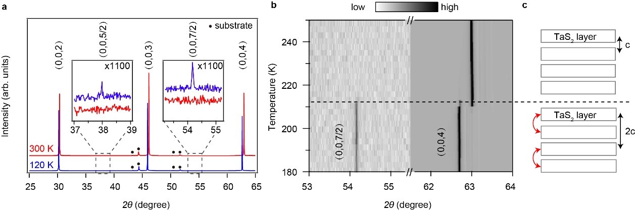 图1:变温依赖的X射线衍射谱。a1T-TaS2在低温120K和常温300K的沿c轴方向衍射谱对比图,插图是放大1100倍的(0, 0, 5/2)和(0, 0, 7/2)半整数峰。b1T-TaS2在升温过程中(0, 0, 7/2)和(0, 0, 4)衍射峰的演化图。c1T-TaS2层间二聚的示意图。