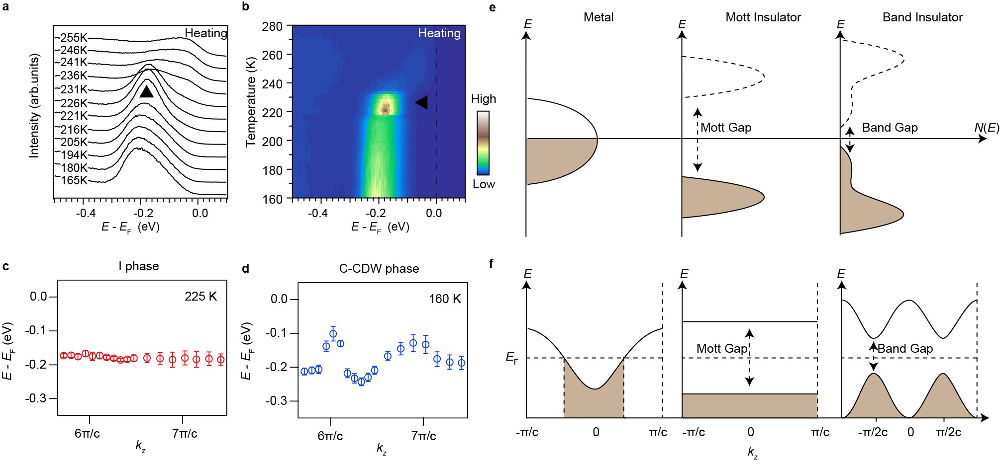 图2:能带随温度演变的ARPES数据和示意图。a, b1T-TaS2在变温过程中的G点附近的能量分布曲线和相应的温度依赖演化图。c, d1T-TaS2在I态和C-CDW态的能带沿kz方向的色散。e, f1T-TaS2在不同电子态下的能带演化示意图。