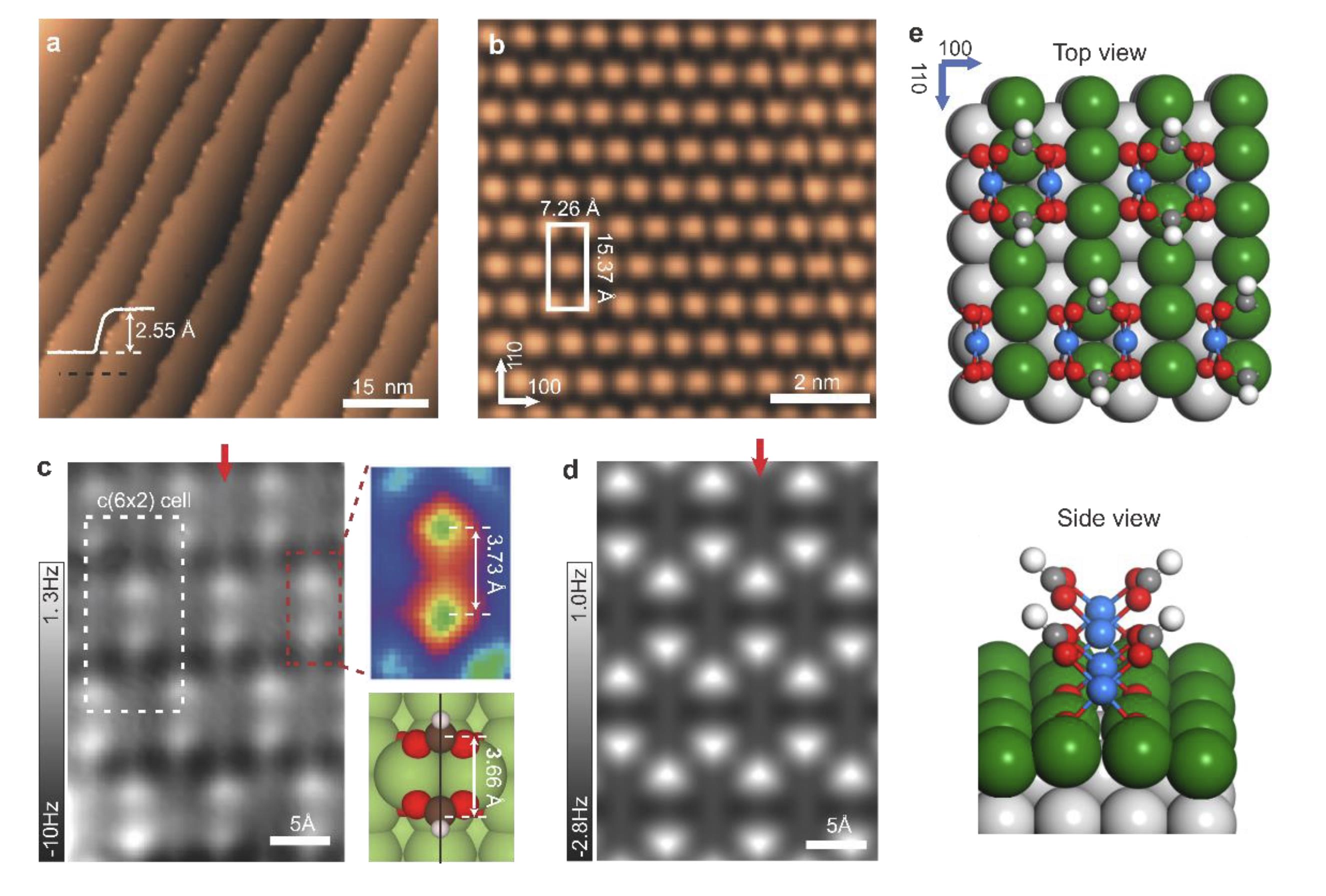 图:a和b,甲酸钠溶液处理后的多晶铜表面的扫描隧道显微镜图像;c和d,高分辨原子力显微镜图像和理论模拟图像;e,表面防腐蚀层的原子模型。