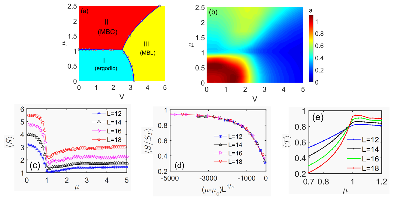 (a) 系统的相图(图中II为多体临界相)。(b) 多分形分析,多体临界相的波函数分布具有多分形行为。(c) 纠缠熵,多体临界相的纠缠熵满足体积律。(d) 有限尺寸分析。(e) 热化性质,多体临界相是非热化的。