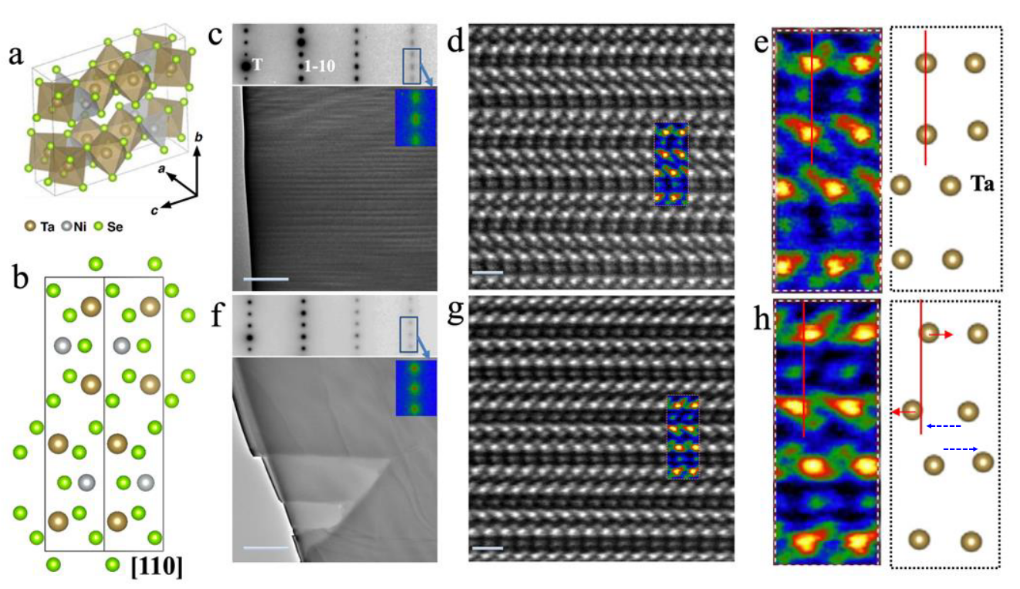 图3 利用电镜TEM对初始态和光诱导低电阻(PI-LR)态的结构表征。(a)(b) Ta2NiSe5的原子模型图以及[1 1 0]方向投影的原子分布图。(c)(d)(e)分别为初始态在300 K时[1 1 0]方向的样品形貌图(衍射斑)、原子分辨图以及选区放大图。(f)(g)(h)是对PI-LR态的相同表征,分别对应于(c)(d)(e)。