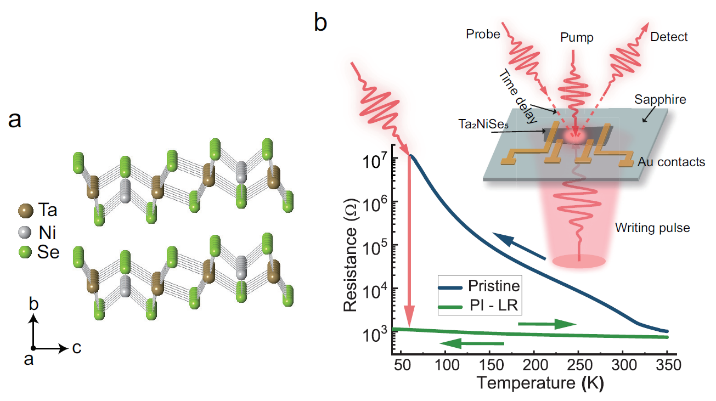 量子物态调控是当今凝聚态物质科学的主要研究前沿之一,对信息科学技术的发展具有潜在的重大影响。对于复杂量子材料系统,由于其内部存在多种自由度的耦合,它们的竞争或合作会导致材料形成不同的量子涨落或量子有序态(如超导、磁性、密度波等)。通常人们通过改变温度、压力、磁场等手段可实现对其量子物态或性质的调控。近年来随着脉冲激光技术的发展,特别是基于具有超强瞬时电场的超短激光脉冲发展起来的超快实验技术正在成为调控和探测量子物态的先进手段之一。通常弱场激发下可利用超快光谱技术探测材料在激发后由非平衡态到平衡态的动力学弛豫过程,而强场脉冲激光激发则可能驱动量子材料发生超快时间尺度的相变。然而,超快脉冲激光诱导的稳定相变仍处于早期研究阶段,特别是对绝缘体到金属相变的研究。