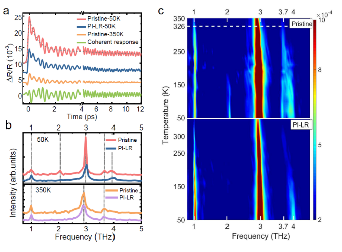 图2 Ta2NiSe5光诱导相变的超快时间分辨光谱分析。(a) 初始态(Pristine)及光诱导低电阻态(PI-LR)时域反射率光谱图。(b) 初始态和低电阻态在低温50 K和高温350 K的声子对照谱图。(c) 50 K-350 K变温过程中,初始态和低电阻态的声子演变过程。