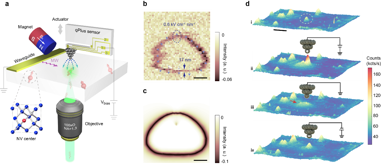 a 基于NV的扫描电场强度计示意图;b和c 利用浅层NV对针尖电场进行扫描成像得到的实验图及其模拟图;d 利用针尖局域电场对单个NV的电荷态进行调控