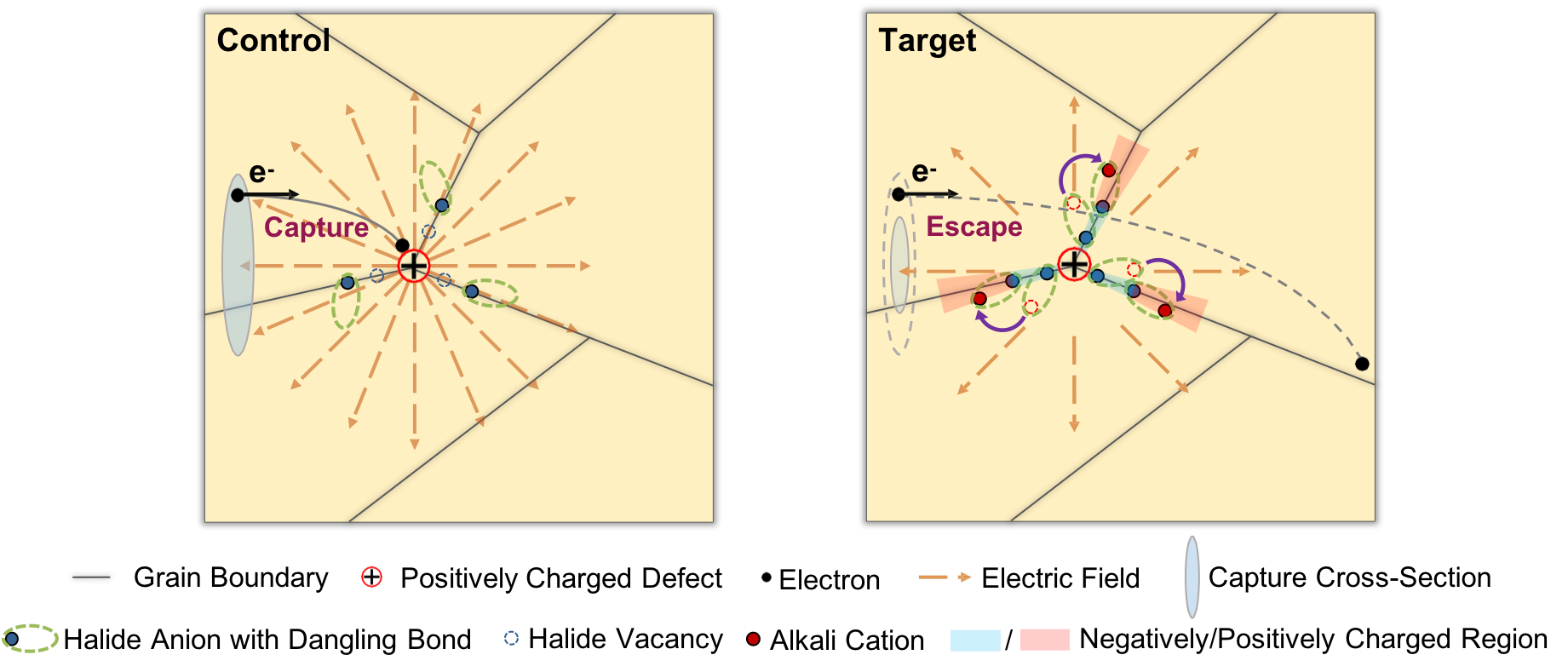 针对此问题,9428cn太阳集团古天乐、人工微结构和介观物理国家重点实验室、纳光电子前沿科学中心极端光学研究团队朱瑞研究员、龚旗煌院士课题组与英国萨里大学张伟教授、美国劳伦斯伯克利国家实验室Thomas P. Russell教授等组成联合研究团队,基于前期在反式结构钙钛矿光伏器件上的研究成果,以介电环境调控为指导,来实现钙钛矿薄膜缺陷的有效屏蔽,助力提升钙钛矿光伏器件的性能。一方面,研究工作由局域库仑相互作用开始,参考已有研究,从理论上阐明了调控钙钛矿的介电响应可以减小缺陷对电荷载流子的捕获截面,从而对缺陷产生屏蔽效应。另一方面,从实验上借助碱金属离子对介电环境的调节能力,在钙钛矿薄膜中有效加速了空间电荷区域钙钛矿的介电响应,使得缺陷捕获截面显著减小,从而产生介电屏蔽效应;该效应降低了载流子被缺陷捕获的几率,即使缺陷仍然存在,它们在某种程度上对电荷载流子也是“不可见”的,形成了缺陷的“隐身”效果,即“缺陷隐身”(如图)。同时,钙钛矿薄膜的质量整体提高,载流子的表面复合与电声耦合动力学过程明显改善,非辐射损失通道得到全面、显著抑制。最终,在反式结构钙钛矿光伏器件中获得了超过22%的光电转换效率。该研究通过对钙钛矿中缺陷捕获载流子过程的深入认知,进一步发展了调控降低缺陷诱导非辐射损失的新思路,实验验证了通过介电调控来实现高效钙钛矿光伏器件的可行性,为领域发展拓展了新的方向。