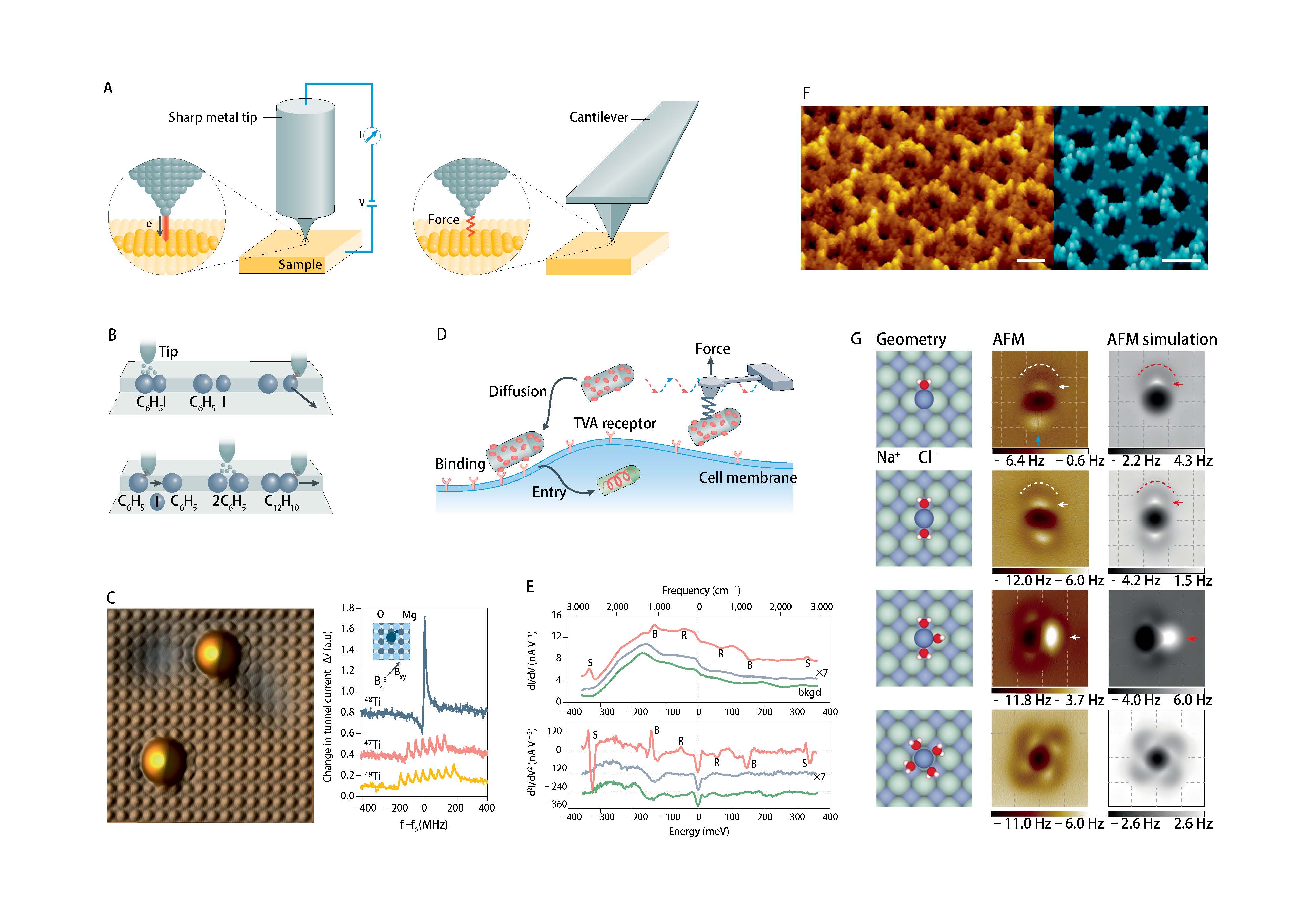 A.扫描隧道显微镜和原子力显微镜示意图;B.利用扫描探针操控单分子化学反应;C.单个Ti原子的磁共振谱线;D.利用力谱探测病毒在细胞上的扩散和结合行为;E.单个水分子的振动谱;F.外膜蛋白质的原子力显微镜成像;G.单个水合钠离子的原子力显微镜成像