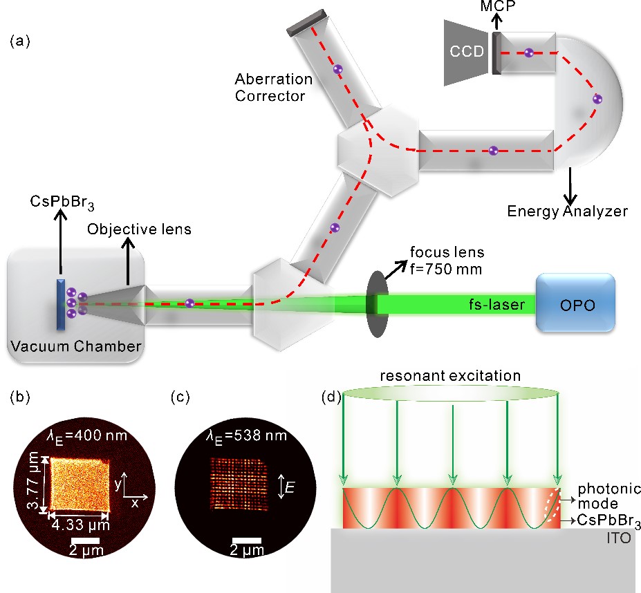 研究团队基于飞秒-纳米时空分辨光学实验系统研究了钙钛矿表面缺陷态的微观动力学特性(Nano Letters, 21(7), 2021);近期利用PEEM进一步开展了无机钙钛矿CsPbBr3微腔的空间特性研究(图1(a))。光电子成像系统具有高达10 nm的空间分辨率,可以表征钙钛矿微腔表面的光电子分布。研究发现,光电子成像结果与激发光波长(λE)相关:当λE=400 nm时,钙钛矿微腔表面的光电子分布均匀,反映了样品表面形貌特性(图1(b));在亚禁带共振光激发(λE=538 nm)条件下,钙钛矿微腔表面呈现清晰的干涉模式(图1(c))。图1(d)给出了钙钛矿微腔表面的干涉模式形成机理,即微腔内传播的光子学模式与入射光场的干涉结果。