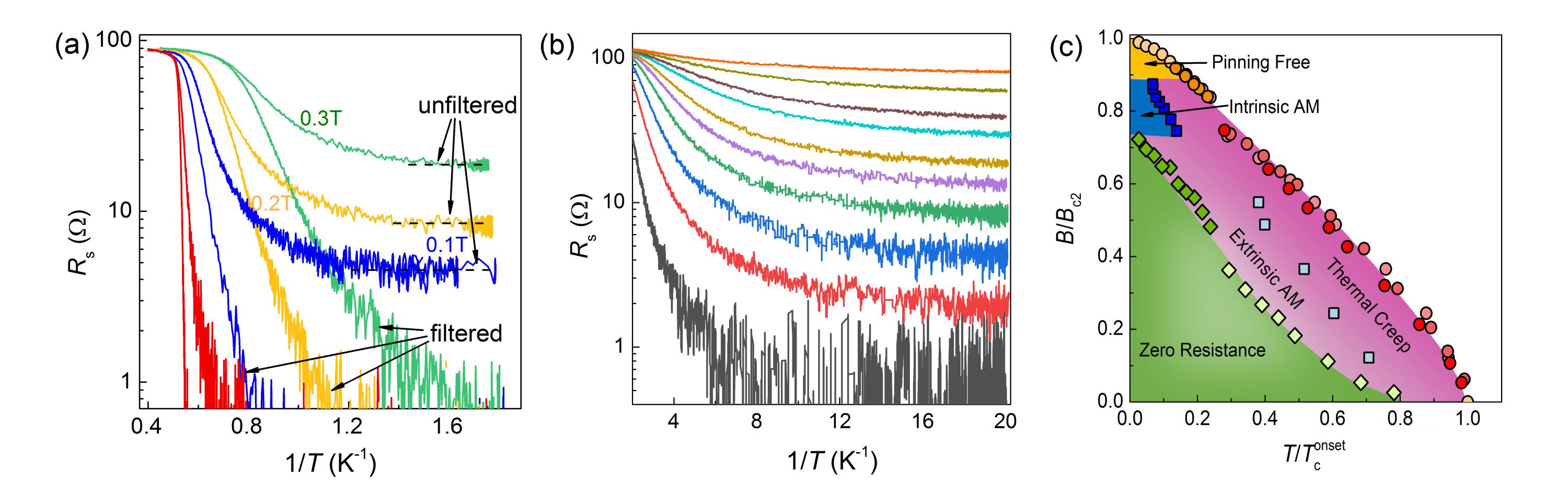 最近,9428cn太阳集团古天乐量子材料科学中心王健教授与林熙研究员、中国石油大学(北京)邢颖副教授、中国人民大学刘易副研究员等合作,对机械剥离的过渡金属硫化物4Ha-TaSe2(4Ha相二硒化钽)超导薄片开展了一系列精密的电输运实验研究。联合研究团队首先通过高频滤波对照实验,直接观测到高频噪声诱导的非本征反常金属态;随后在更低温、更高磁场下,通过对测量线路进行有效滤波后,进一步得到了本征反常金属态的可靠实验证据,并绘制了包含本征和非本征反常金属态的完备相图(下图)。该项工作揭示了在易受环境影响的二维微纳超导器件中,尽管存在高频噪声诱导的非本征反常金属态,但在更低温度下反常金属态仍然可以作为量子基态存在;同时,证实了二维晶体超导器件中本征反常金属态的存在以及在量子基态研究中对低温测量进行有效滤波的必要性。