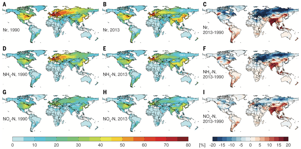 图1 1990—2013年氮排放对全球PM2.5空气污染的贡献百分率:A~C.活性氮(Nr)排放的PM2.5 N-share及期间改变值;D~F.氨氮(NH3)排放的PM2.5 N-share及期间改变值;G~I.氮氧化物(NOx)排放的PM2.5 N-share及期间改变值