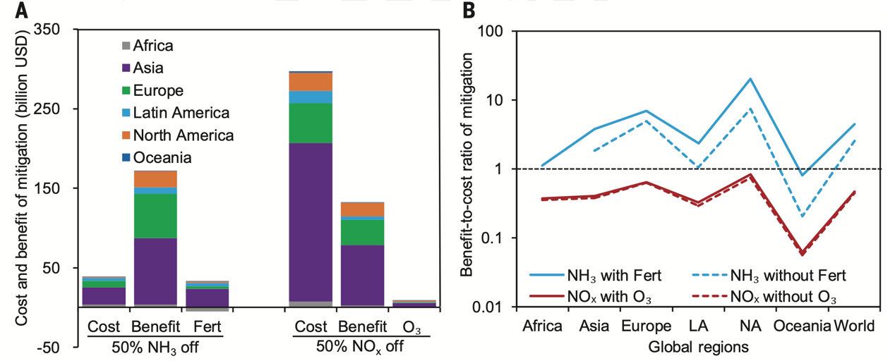 图2 全球各大区域氨氮和氮氧化物减排50%的成本和收益:A.氨氮减排收益包含PM2.5污染减轻的健康效益以及减小氮肥施用量(Fert)的经济节约,氮氧化物减排收益包含PM2.5和臭氧(O3)污染减轻带来的健康效益;B.氮减排收益与成本的比值(高于“1”表示减排收益高于成本)