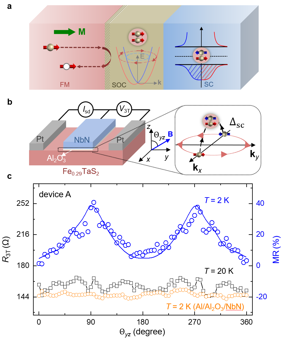 图 (a)铁磁/超导异质结界面由Rashba自旋轨道耦合诱导的自旋三重态超导图;(b)FexTaS2/NbN异质结器件结构与实验测量示意图;(c)二维范德瓦尔斯铁磁FexTaS2/NbN界面由各向异性自旋三重态Andreev 反射诱导的磁阻行为