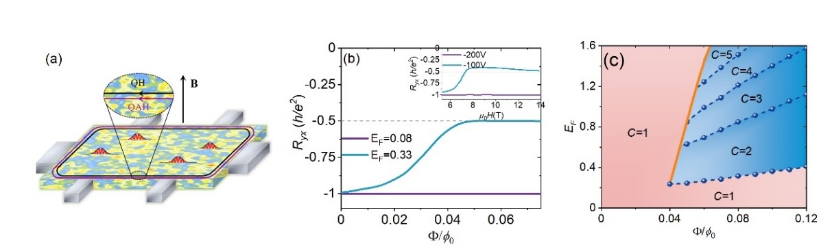 强磁场下无序MnBi2Te4中量子霍尔相和量子反常霍尔相共存的图像(a)、固定费米面的霍尔电阻(b)和相应的相图(c)