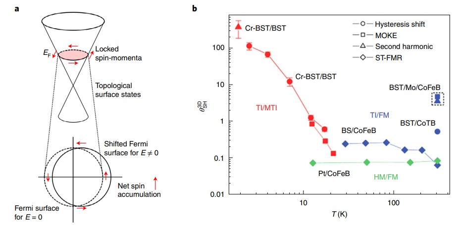 在拓扑绝缘体表面上电流导致的自旋积累(a)和从不同实验手段、材料结构的结果中提取的自旋霍尔角(b)
