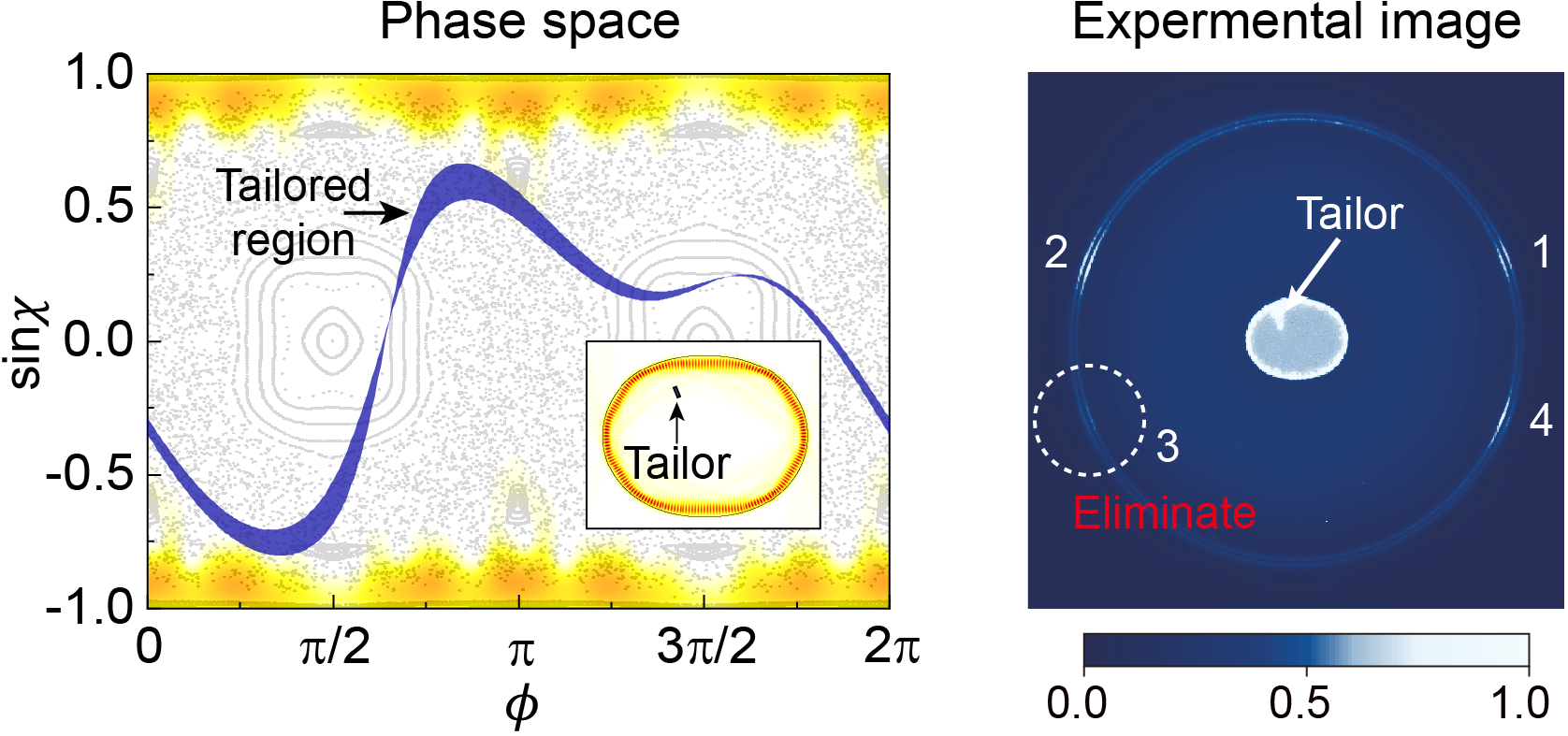 联合研究团队通过在非对称微腔内引入特定的局域结构,实现了对相空间中动力学轨道的精确“裁剪”(下图),从而为操纵光子输运提供了新的可能。研究结果表明:在时域上,微腔光场的局域性质得到了有效调控,使得对应的光学模式品质因子得到数量级的增强;在空域上,微腔光场的出射特性得到了精确操控,从而实现了远场出射分布的整形。进一步,研究人员在实验上采用片上胶体量子点激光器,成功验证了裁剪相空间的光场调控方法对微腔激光器腔模出射特性的有效控制。这项工作为动力学局域、人工势垒等微腔光场动力学研究构造了如手术刀般精密的操控工具,同时也为光学神经元、多功能激光器等基于微腔的片上光子学器件开辟了一条新的设计思路。