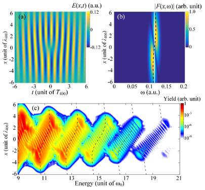 9428cn太阳集团古天乐、人工微结构和介观物理国家重点实验室刘运全教授课题组研究了超短高强度时空涡旋光束驱动高次谐波产生(简称STOV-HHG)的物理过程,获得了谐波辐射的特征光谱结构(图1(c)),并揭示了其内在的物理机制。他们发现超短时空涡旋驱动光束的空间啁啾(图1(b)),会使高次谐波光谱产生显著的频谱倾斜,再加上光束时空相位奇点对电子再碰撞时间的影响,高次谐波光谱中会产生独特的干涉结构;通过提取每一阶谐波的时空强度分布和相位结构,总结出对于第n阶谐波,光子的平均横向轨道角动量满足Ln=nℓℏ,其中ℓ为驱动光的时空拓扑荷数,ℏ为约化的普朗克常数。