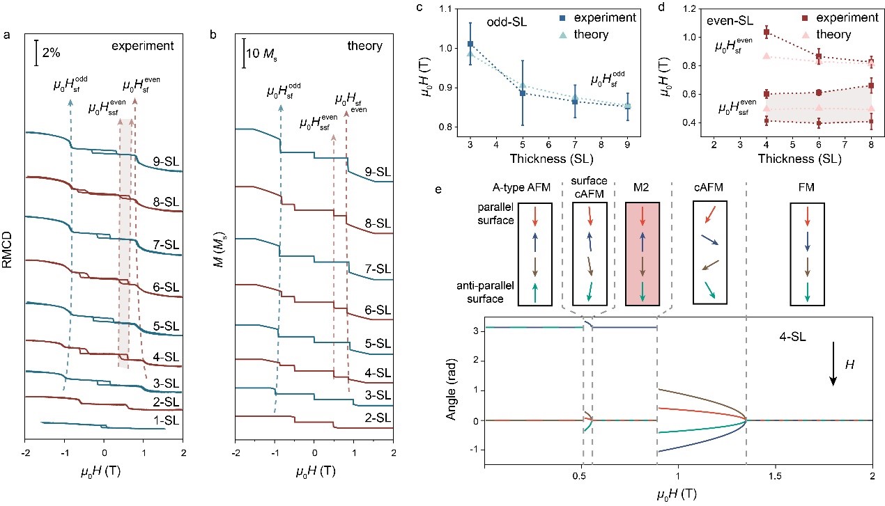 在反铁磁相研究中(图2),1~9层样品呈现典型的A型反铁磁行为,体现出明显的奇偶层数震荡效应。在奇数层中,样品因未补偿的一层净磁矩在零场附近出现迟滞回线,并随磁场增加,除1层样品外均经历一次“自旋-翻转”(spin-flop)过程,最后达到磁饱和态。而在偶数层中,因不再有未补偿的净磁矩,零场附近迟滞回线消失;在大于2层的样品中,随着磁场增大,会先经历一次表面“自旋-翻转”过程,达到一个共线的M2态(磁矩为2层MnSb2Te4的静磁矩),也就是磁矩与外磁场反平行的表面层磁矩从与磁场反平行翻转到了与磁场平行,之后,再经历体“自旋-翻转”过程,最后达到磁饱和态。联合研究团队通过一维线性链模型拟合实验数据,获得材料的各向异性能和层间相互作用能,从理论上得到了不同层数反铁磁样品的磁演化过程。并发现反铁磁相MnSb2Te4的各项异性能与相互作用能的比值略大于MnBi2Te4中的该比值,解释了在MnBi2Te4中没有观测到稳定M2态的原因,由此也为研究共线M2态下的量子输运性质研究提供了一个材料体系。