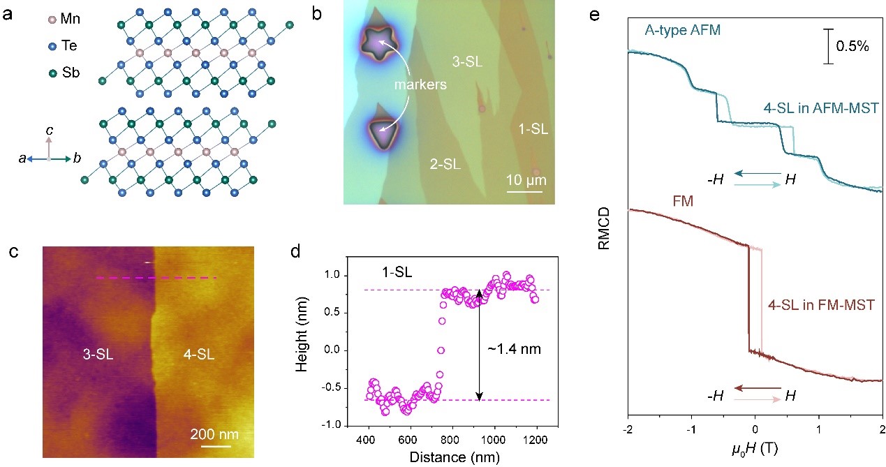 图1 (a)MnSb2Te4原子结构图;(b~e)少层样品表征以及四层反铁磁相和铁磁相MnSb2Te4的磁演化