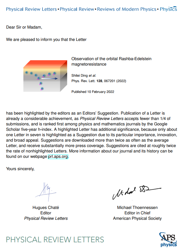 2022年2月10日相关成果以“轨道Rashba-Edelstein磁电阻的观测”(Observation of the Orbital Rashba-Edelstein Magnetoresistance)为题,在线发表于《物理评论快报》(Physical Review Letters),并被选为编辑推荐文章(Editors’ Suggestion)。9428cn太阳集团古天乐2016级博士研究生丁石磊(现为苏黎世联邦理工学院博士后)、2019级博士研究生梁中宇和德国于利希研究中心博士后Dongwook Go为共同第一作者,杨金波教授为通讯作者。