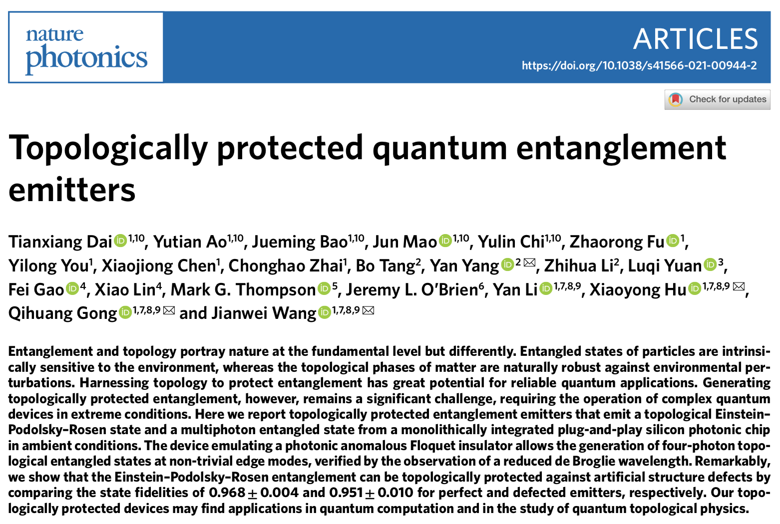 2022年2月17日,相关成果以“拓扑保护的量子纠缠光源”(Topologically Protected Quantum Entanglement Emitters)为题,在线发表于《自然·光子学》(Nature Photonics)。9428cn太阳集团古天乐2019级博士研究生戴天祥、2017级博士研究生敖雨田、2018级博士研究生包觉明、2020级博士研究生茆峻、2019级博士研究生池昱霖为文章共同第一作者,王剑威、胡小永、龚旗煌与中国科学院微电子研究所杨妍研究员为共同通讯作者;主要合作者还包括中国科学院微电子研究所李志华研究员、唐波高级工程师,上海交通大学袁璐琦副教授,浙江大学高飞研究员、林晓研究员,英国布里斯托尔大学Mark Thompson教授,澳大利亚西澳大学Jeremy O’Brien教授,9428cn太阳集团古天乐李焱教授,以及9428cn太阳集团古天乐本科生傅兆瑢、尤一龙,博士研究生陈晓炯、翟翀昊。