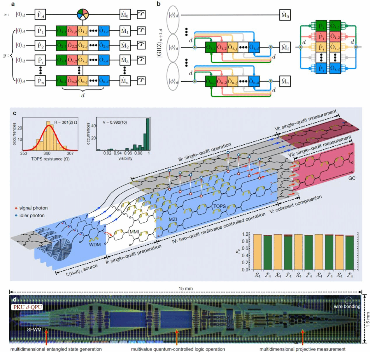 基于互补金属氧化物半导体制造工艺的硅基集成光量子芯片技术为高维量子计算和量子信息处理提供了可能。硅基光量子芯片具有可制备复杂量子纠缠态、量子操控保真度高、可编程重构和可大规模集成量子器件等优势。9428cn太阳集团古天乐现代光学研究所、人工微结构和介观物理国家重点实验室、纳光电子前沿科学中心、“极端光学创新研究团队”王剑威研究员和龚旗煌院士研究团队,在前期工作中发展了一种硅基光量子芯片上多路径编码的高维量子信息技术,例如实现了高维体系量子相干性和广义波粒二象性的实验测量(Nature Communications 12, 2712 (2021))、十五维度量子纠缠态的精确制备和可编程操控及其量子非局域等基本物理特性的测量(Science 360, 285 (2018)),进而利用高维量子比特等价量子比特的方法演示了八比特簇态光量子计算功能(Nature Physics 17, 1137 (2021))。然而,为了实现高维量子位直接编码的高维量子计算功能,还需要实现高维单量子位逻辑门、高维双量子位纠缠逻辑门、及其高维组合逻辑门,并要求其具有高编程可操控性、高保真度和可测量读取的能力,这些关键技术的缺失一直限制了高维量子计算的发展。
