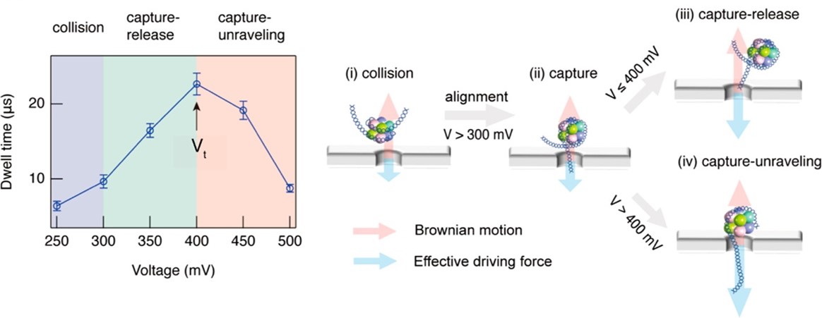 图2 (左图)穿孔电流信号的平均穿孔时间随电压的变化以及解离临界电压;(右图)核小体的穿孔示意图