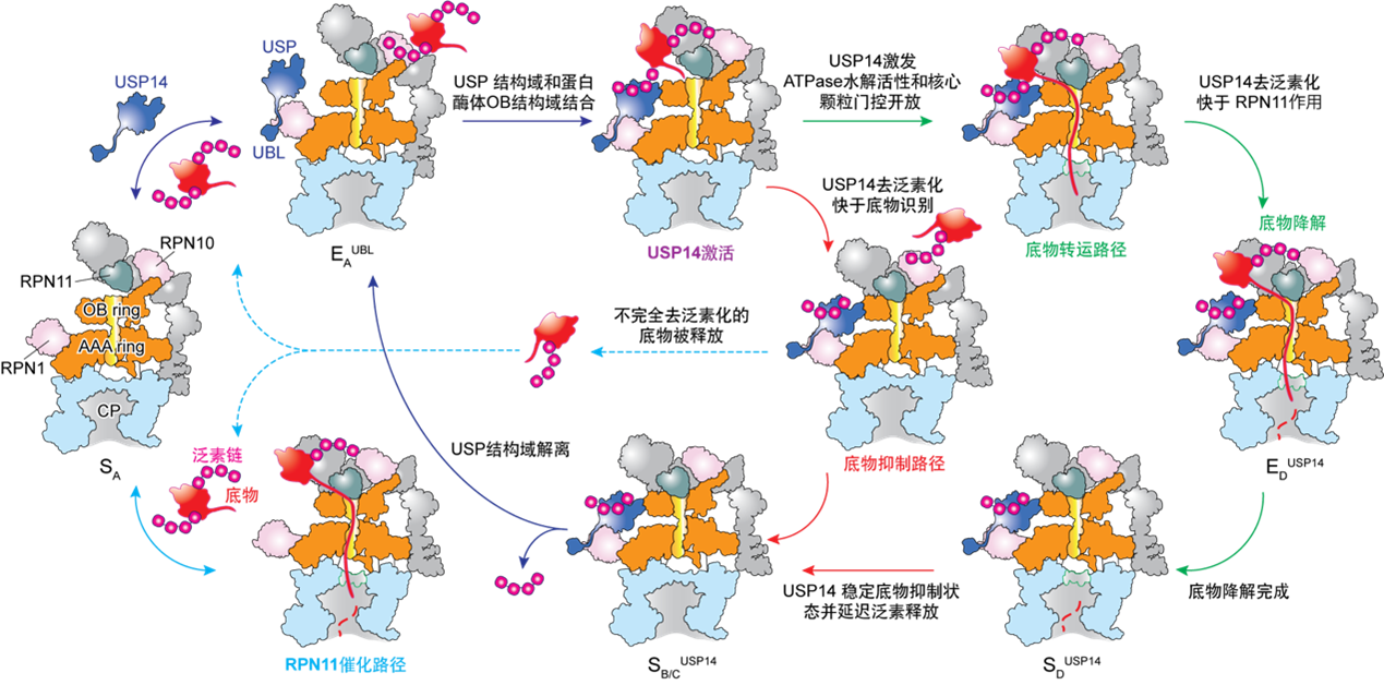蛋白质降解调控是极其重要的基本生物化学过程,在细胞周期、信号转导、免疫响应、基因调控、新陈代谢、神经退行、癌症肿瘤、病毒感染以及蛋白毒性响应等主要细胞分子过程中发挥着关键的调控作用。在真核细胞中,绝大部分胞内蛋白都是通过泛素蛋白酶体途径(Ubiquitin-proteasome pathway),经过泛素化标记被蛋白酶体全酶降解的。2004年,Aaron Ciechanover,Irwin Rose和Avram Hershko三位科学家因“对该泛素化通路介导蛋白质降解的历史性发现”被授予诺贝尔化学奖。蛋白酶体全酶,又称为26S proteasome,是由中间一个圆柱形20S核心颗粒和两端覆盖的一个或两个19S调节颗粒组成。19S包含一个环形异源六聚体马达——AAA-ATPase,通过多个协同ATP水解模式调控蛋白酶体降解泛素化底物。蛋白酶体功能紊乱与人体多种疾病相关,如癌症、神经退行性疾病和免疫疾病等。蛋白酶体是美国食品药品监督管理局(FDA)批准的多种治疗癌症的上市小分子药物的直接靶标。在正常细胞中,蛋白酶体的功能受到多个水平的严格调控。去泛素化酶USP14是最主要的蛋白酶体调控分子,被认为是一个潜力巨大的治疗癌症和神经退行性疾病的重要靶标,其小分子抑制剂曾进入过美国一期临床研究,但围绕USP14功能机制的一系列悬而未决的关键问题极大地限制了其靶向药物分子的开发和临床应用。USP14通过结合26S而被激活,然后以毫秒的时间尺度剪切底物上的泛素链;但其如何被蛋白酶体激活并调控蛋白酶体功能,一直是全球研究机构和生物制药领域期待解决的关键科学问题。
