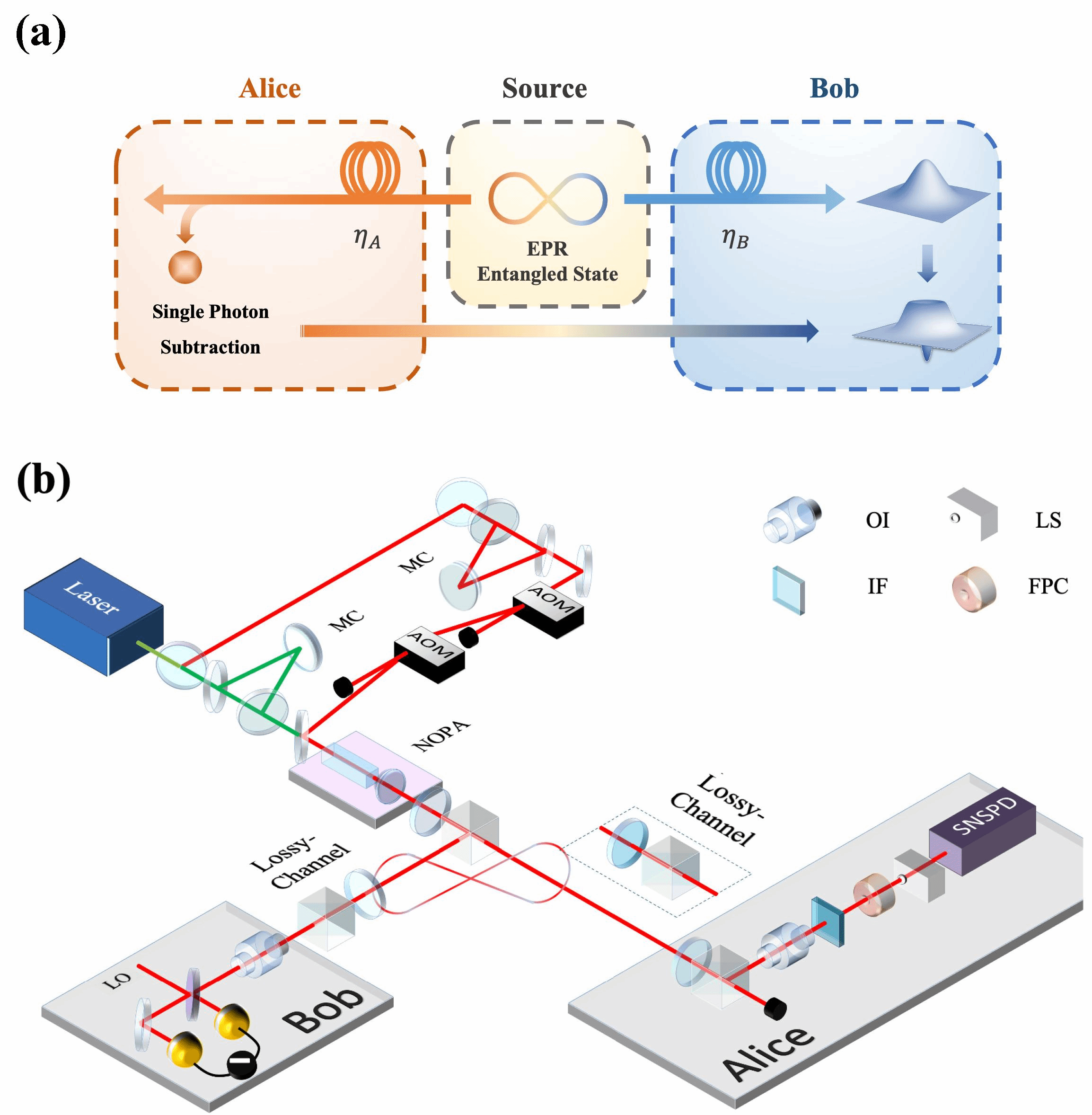 图2(a)远程制备具有Wigner负性非高斯态的实验原理图;(b)实验装置图。
