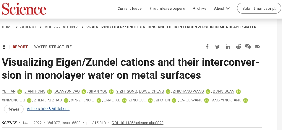 Y. Tian, J. Hong, D. Cao, S. You, Y. Song, B. Cheng, Z. Wang, D. Guan, X. Liu, Z. Zhao, X.-Z. Li, L.-M. Xu, J. Guo*, J. Chen*, E.-G. Wang* and Y. Jiang*, Visualizing Eigen/Zundel cations and their interconversion in monolayer water on metal surfaces, Science 377, 315-319 (2022). (https://www.science.org/doi/10.1126/science.abo0823)