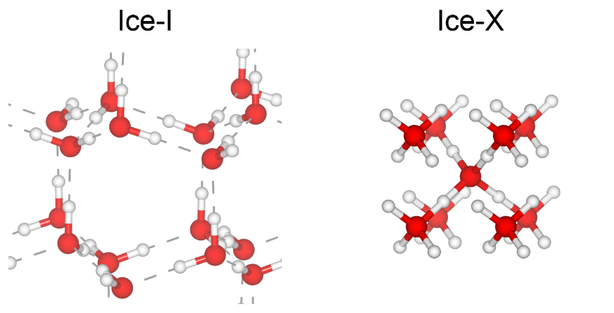 图1 冰I相与冰X相。冰I相是自然界最常见的冰相,水分子之间形成正常氢键(O-H‧‧‧O);冰X相是水分子在100多万个大气压下的对称氢键相(O-H-O),氢原子位于两个氧原子之间的几何中心位置。