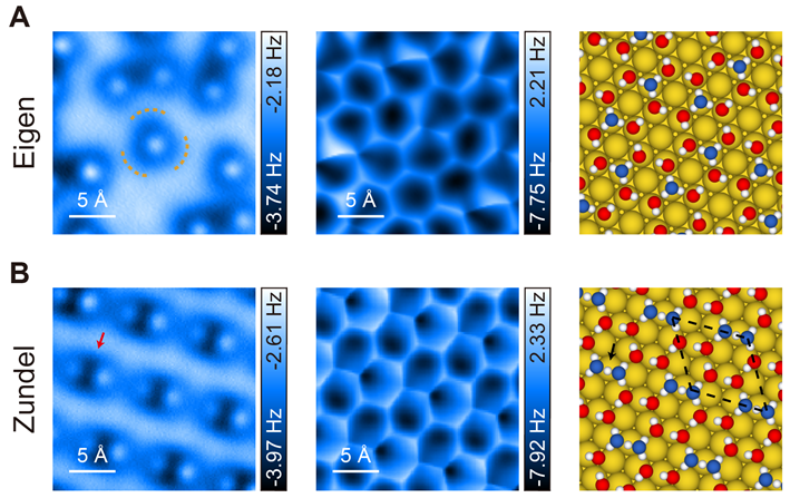 图2 Au(111)表面上Eigen(A)以及Zundel(B)构型二维冰的AFM实验图