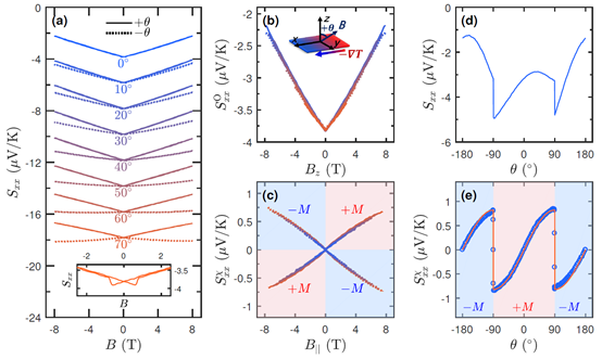 图 (a)磁场偏离z轴时出现关于面内磁场反对称的塞贝克信号;(b)不同角度下的正常塞贝克信号;(c)不同角度下关于面内磁场反对称的塞贝克信号,磁化翻转时该信号也反号;(d)固定磁场在yz面旋转时塞贝克信号的角度依赖;(e)通过反对称得到的关于面内磁场反对称的塞贝克信号。