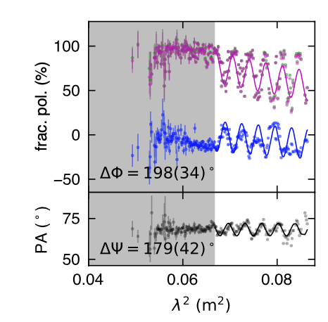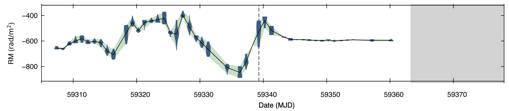 法拉第旋转量的短时标演化。 阴影区有FAST观测,但是没有探测到射电暴发,说明快速射电暴是突然熄灭的