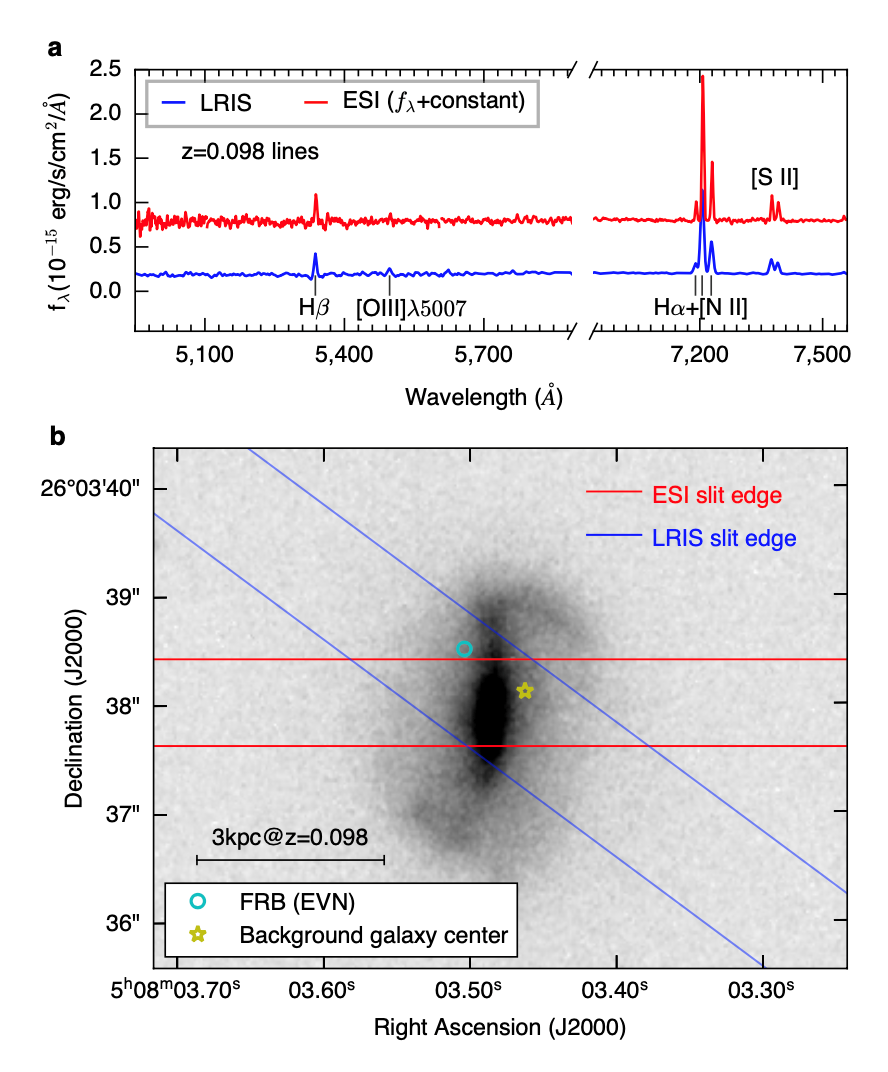 通过国际合作,他们使用美国10米Keck光学望远镜对这个快速射电暴的宿主星系进行了深度观测,发现其宿主星系是约为银河系尺度大小、富金属的棒旋星系,并且发现这个快速射电暴所在区域恒星密度较低,处于旋臂之间,距离星系中心中等距离。该团队认为这个环境与由于大质量恒星极端爆炸导致的超亮超新星或伽马射线暴后形成的年轻磁星模型不相符。