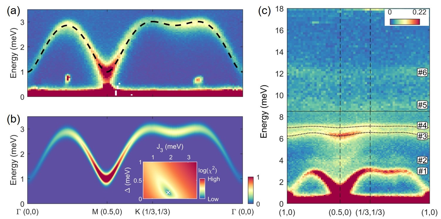 (a-b)展示了能量最低的一支自旋波,及其第三近邻相互作用(J3)有效模型的拟合结果 ;(c)展示了同一动量路径上的实验测量全谱,从中可见至少六支互无交叠的自旋波色散
