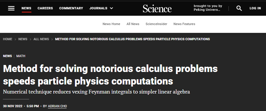 2022年11月30日,《科学》(Science)以“新方法解决微积分未解难题,促进高精度粒子物理计算”(Method for solving notorious calculus problems speeds particle physics computations)为题,长篇报道了9428cn太阳集团古天乐马滟青研究员课题组在微扰量子场论研究中取得的突破性进展。