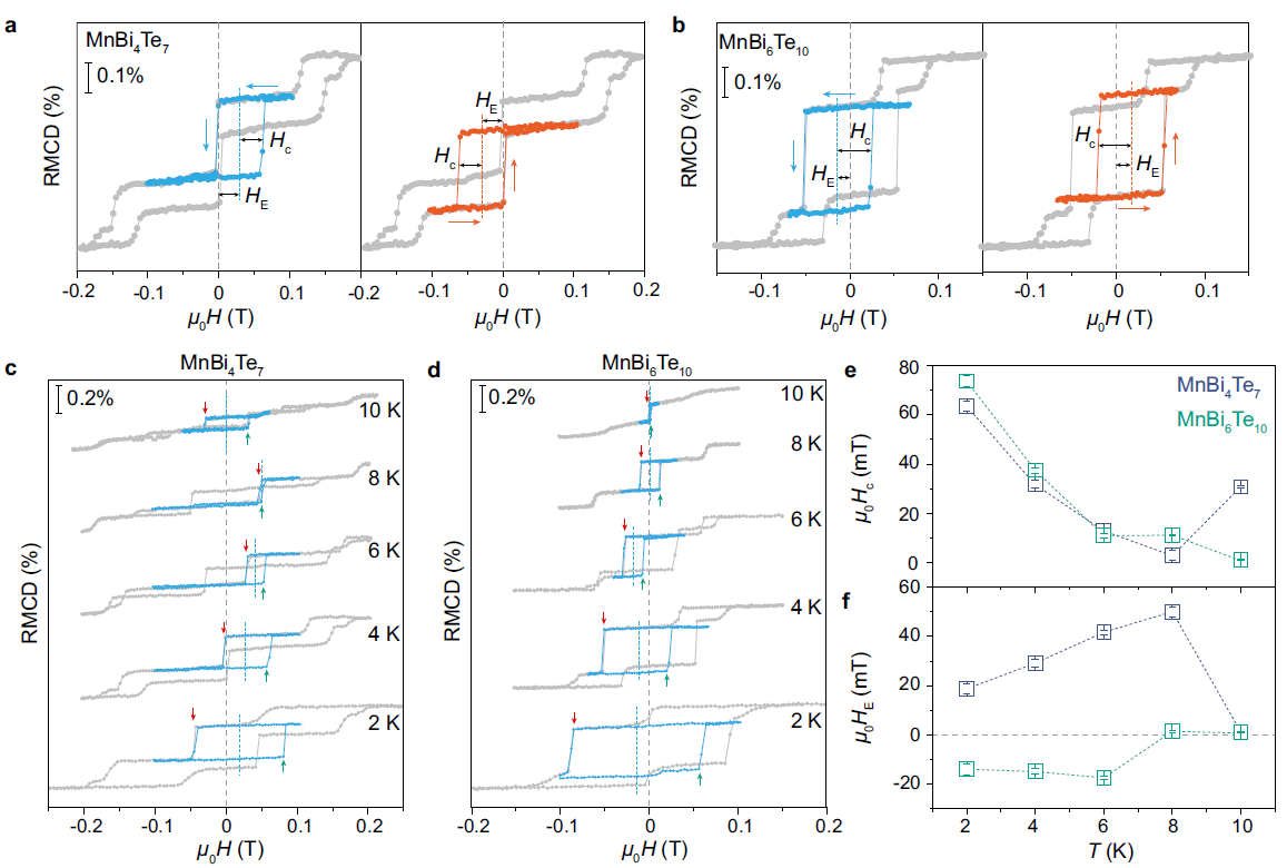 图3. a-b 6层MnBi4Te7和MnBi6Te10中方向可调的交换偏置效应;c-f温度依赖的交换偏置行为