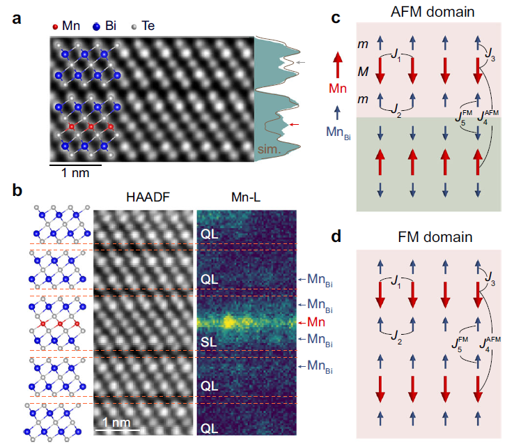 图2. a-b MnBi6Te10截面STEM及元素空间扫描图;c-d MnBi6Te10(及MnBi4Te7)中铁磁与反铁磁基态结构