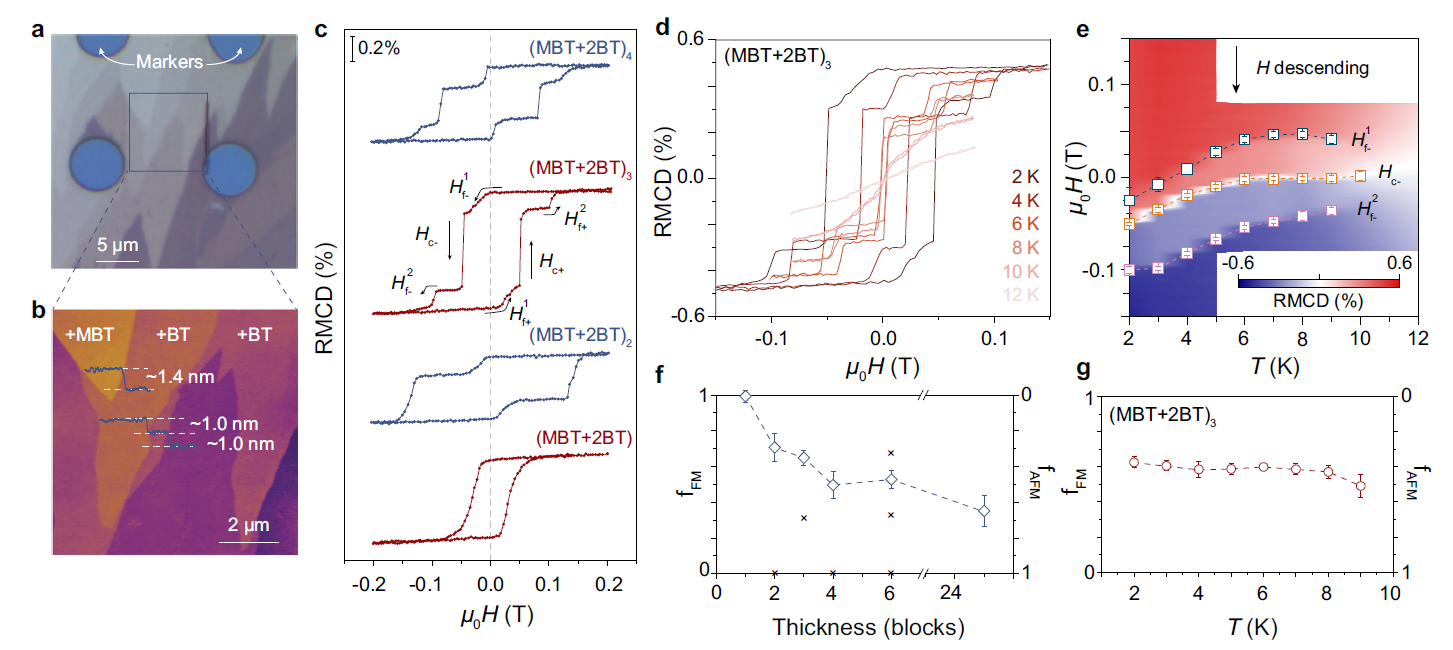 图1. a-b:MnBi6Te10少层样品光学照片及表面形貌扫描图;c:少层MnBi6Te10 RMCD-μ0H磁翻转曲线;d-e: 3层MnBi6Te10温度依赖的磁翻转;f-g:铁磁-反铁磁占比随厚度及温度变化