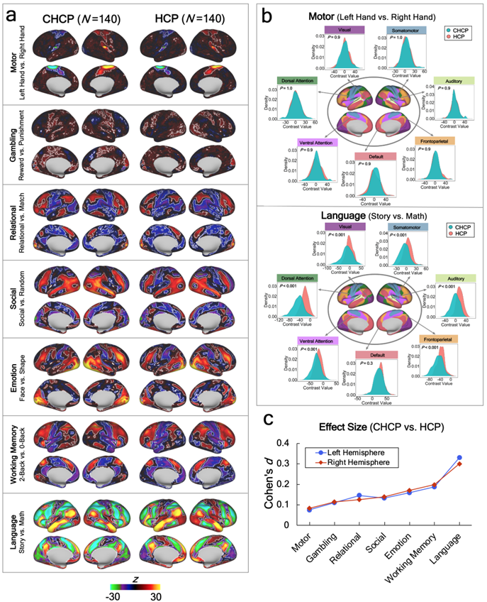 目前CHCP大数据集已实现开放共享。CHCP中国人脑连接组计划研究成果及其数据资源的公布不仅对于促进基于中国人脑影像的脑-行为和脑图谱方面的科学研究具有宝贵意义,更重要的是填补了当前国际上缺少来自非西方群体(比如中国人群)对照的空白,为探索人类不同文化与族裔背景中的脑-行为关联起到了推动作用。基于CHCP和HCP中静息态功能磁共振影像数据建立的中西方大尺度7网络脑功能图谱结果发现中西方静息态脑功能图谱在参与高级认知加工的联合皮质区表现出较大的地形图差异性,而在初级感知觉皮质区的地形图差异性则相对较低 (图1所示)。进一步分析则表明,在七个经典认知任务态下CHCP和HCP的中西方脑功能激活差异主要体现在语言加工任务中, 而简单运动功能相关的脑激活图结果则表现出较低的中西方差异性(图2所示)。